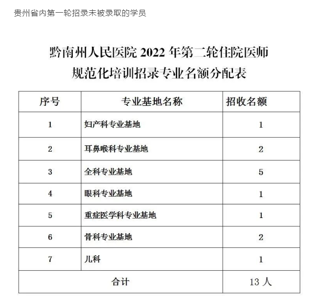 黔南州人民医院始建于1950年,是黔南地区集医疗、教学、科研、预防、保健、急救、康复为一体的国家三级甲等综合医院。是“黔南民族医学高等专科学校第一附属医院”“贵州医科大学附属黔南医院”“遵义医科大学教学医院”“贵州中医药大学教学医院”“卫生部国际紧急救援中心网络医院”“爱婴医院”“黔南州残疾人康复医疗中心”“国家医师资格考试实践技能考试基地”等。医院床位编制1200张,实际开放床位1280张,目前医院在岗职工1785人,其中正高职称51人、副高职称190人、中级职称526人,硕士研究生导师4人,博士2人、硕士97人。临床医技科室设有48个临床医技科室及5个研究所。目前医院占地面积24266平方米,建筑面积76614平方米。2014年8月我院首批入选“国家级住院医师规范化培训基地”,共设14个专业基地。为了更好地培养医学实用人才,按国家有关规定,经省卫健委同意,我基地2022年拟招收80名培训学员,第一批次已招收67人,第二轮拟调剂13人,现将有关事项通知如下。