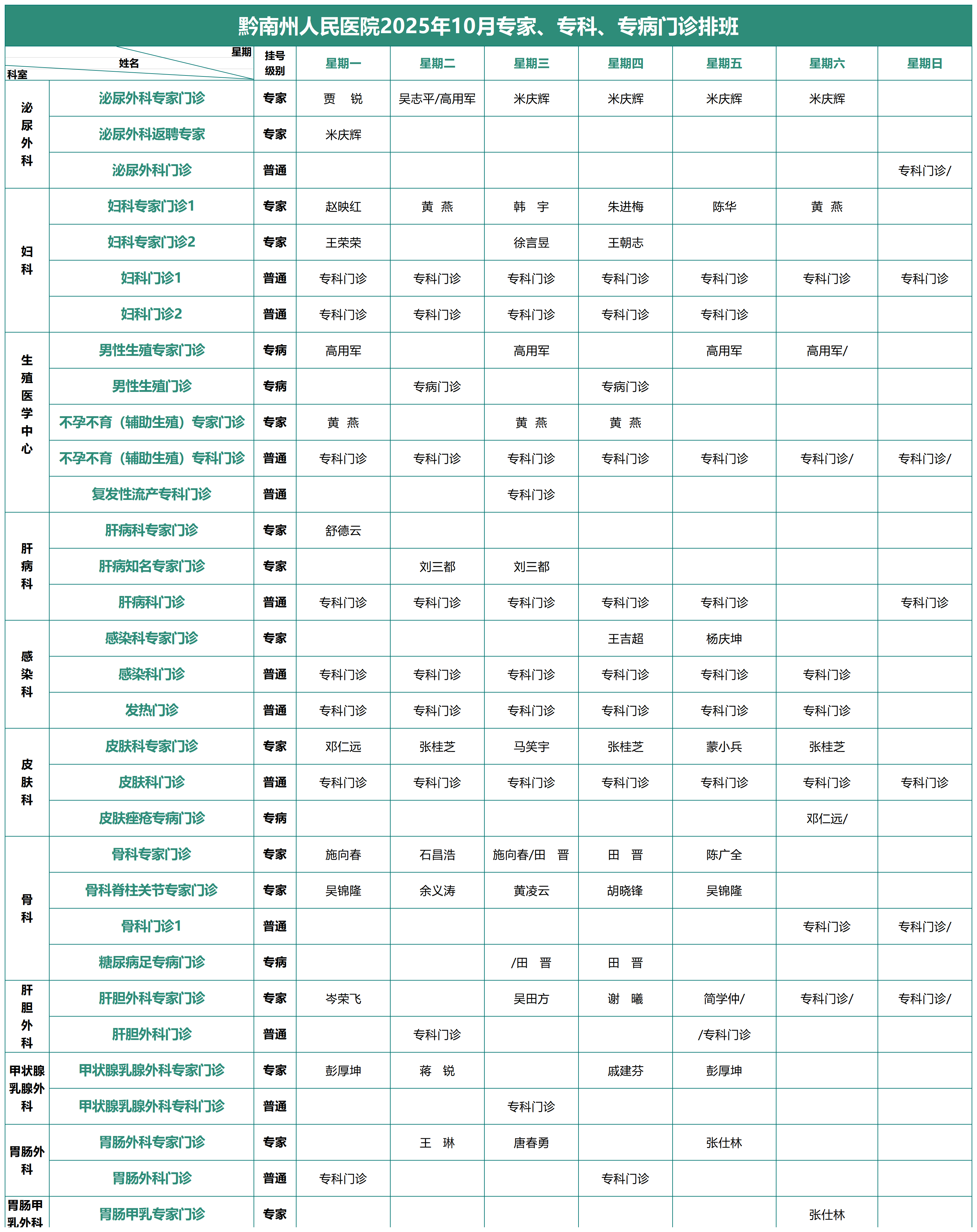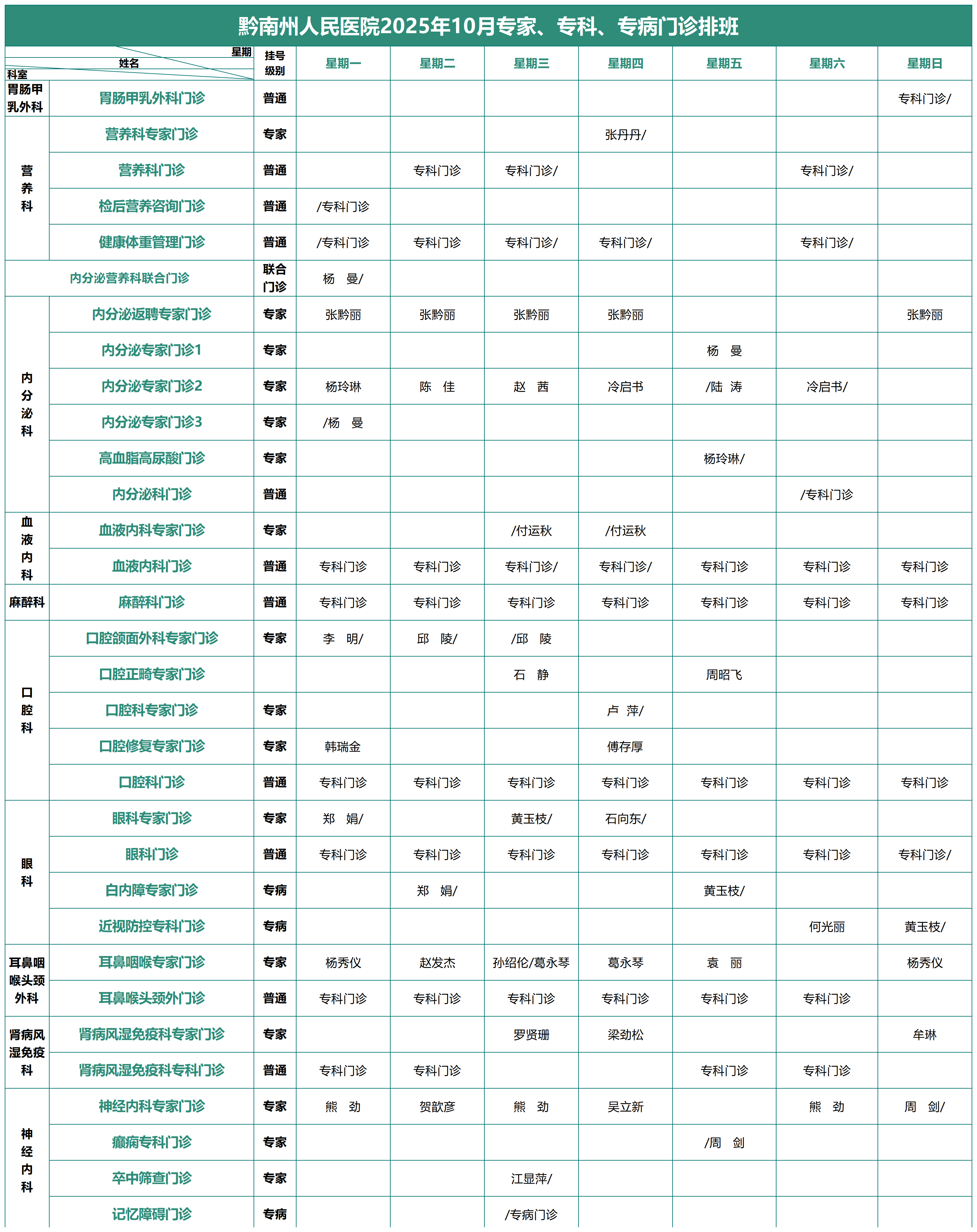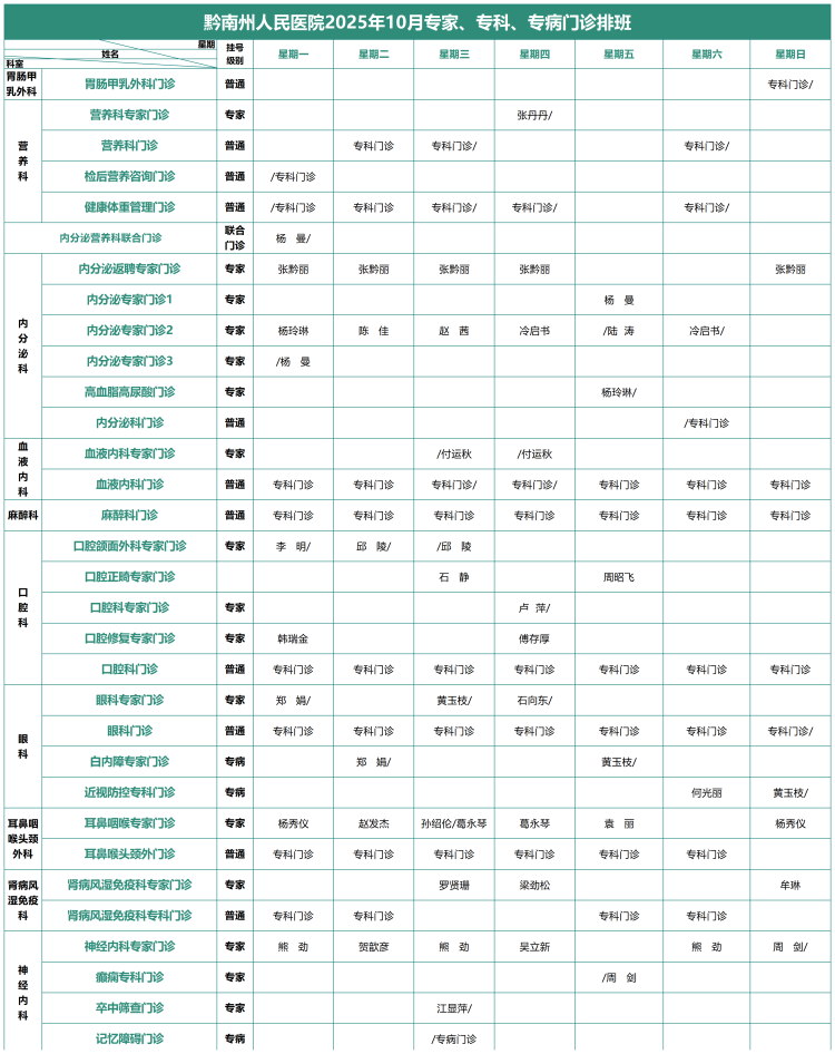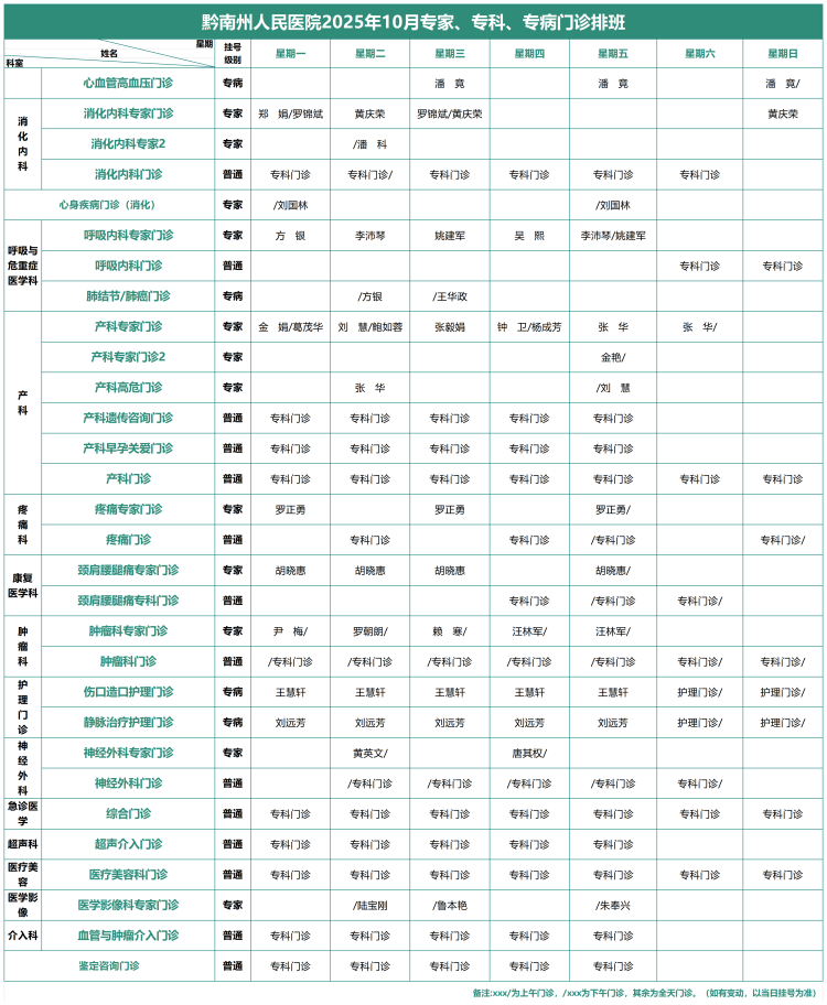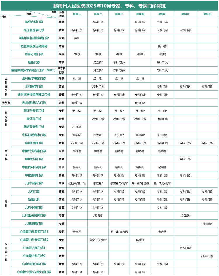 2025年10月专家、专科、专病门诊排班表