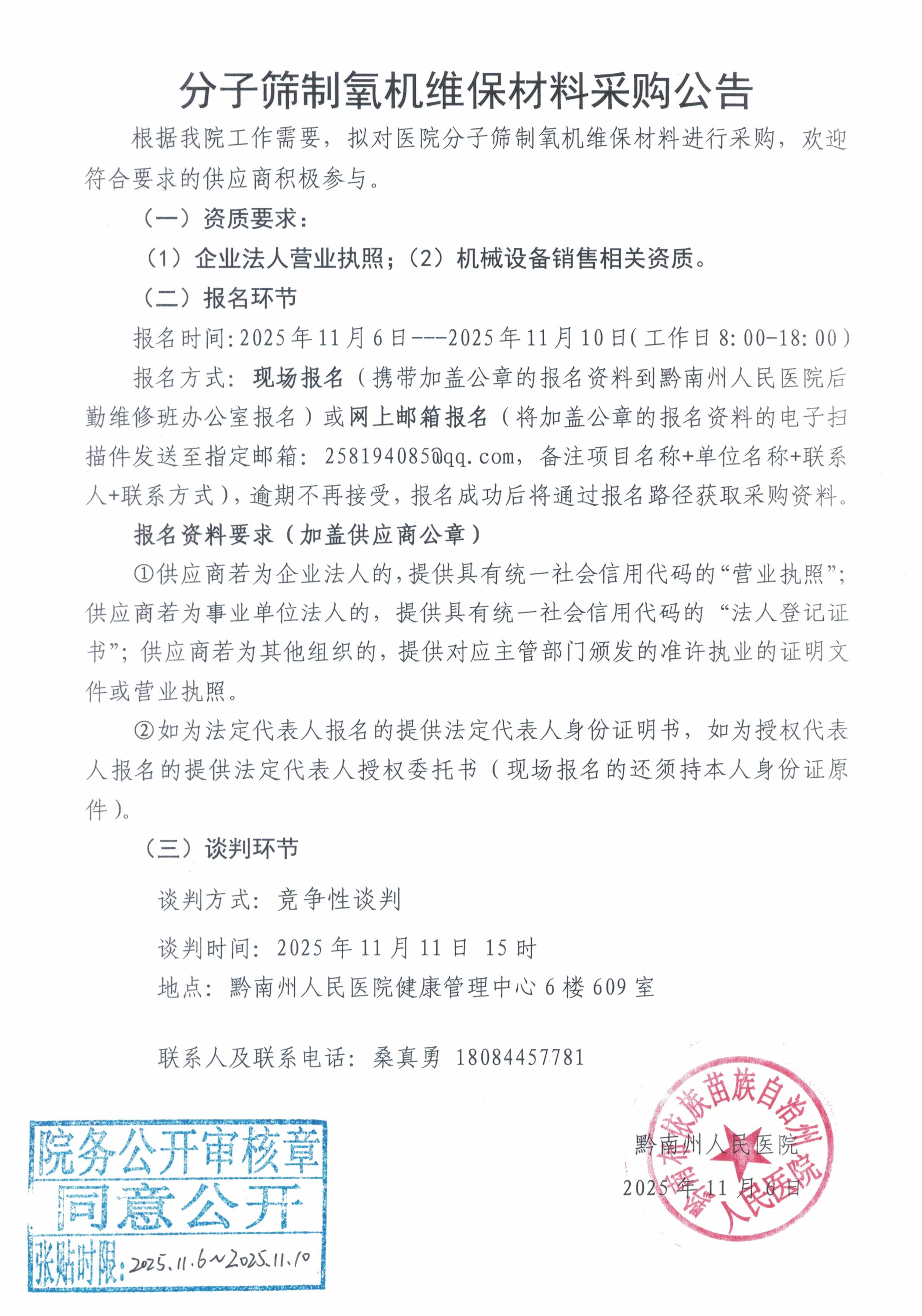 关于黔南州人民医院分子筛制氧机维保材料的采购公告