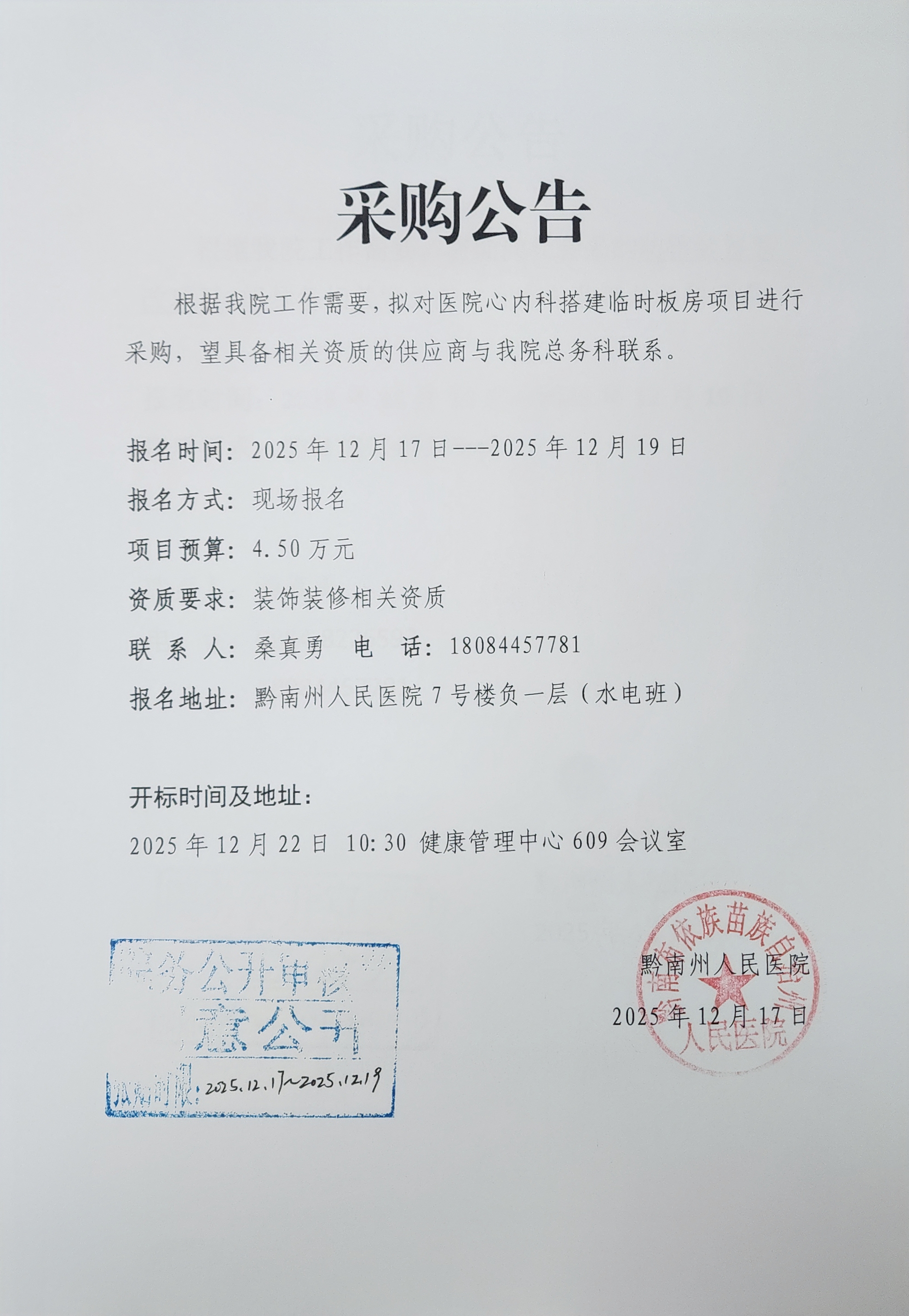 关于黔南州人民医院心内科搭建临时板房项目的采购公告