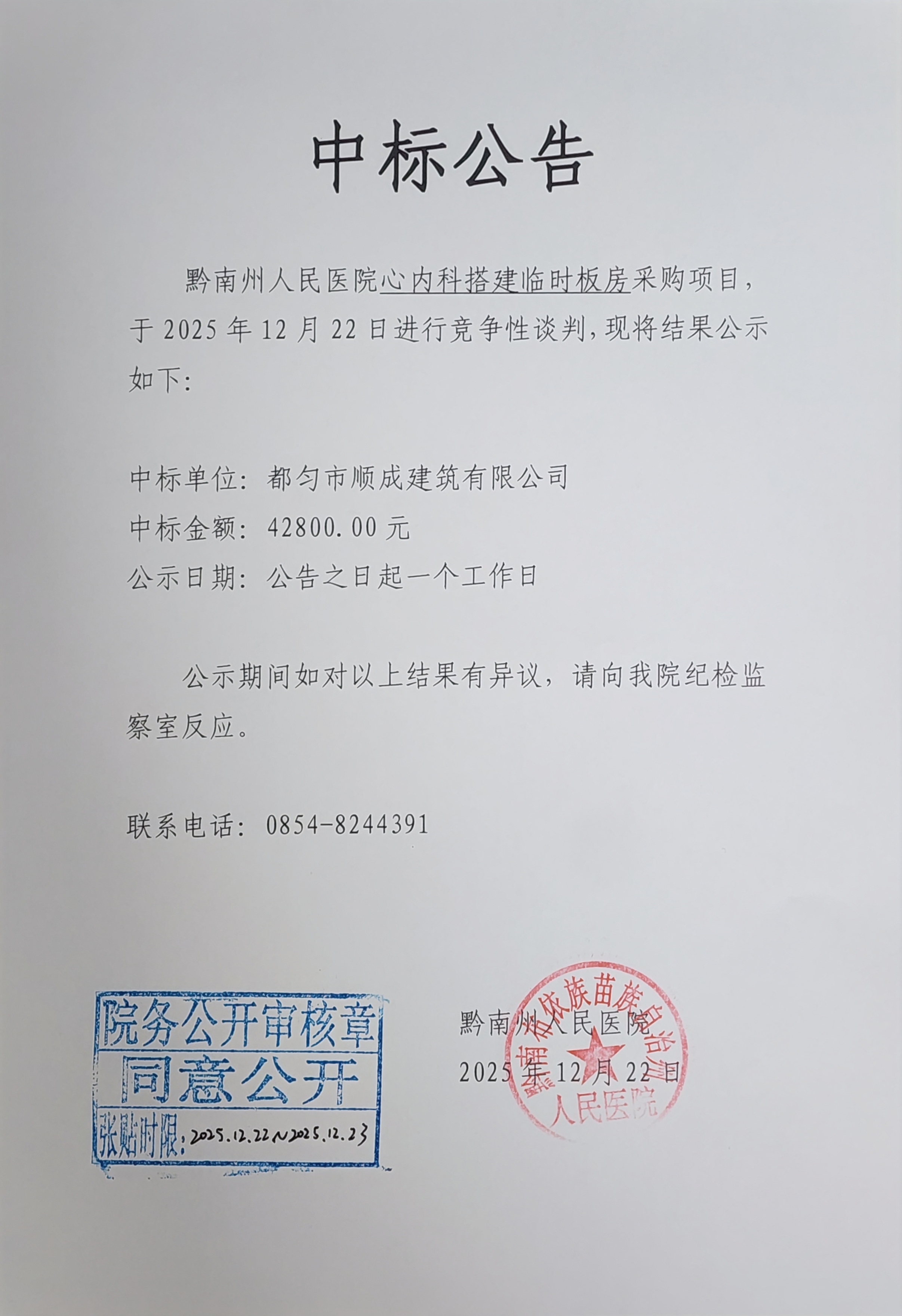 关于黔南州人民医院心内科搭建临时板房项目的中标公告