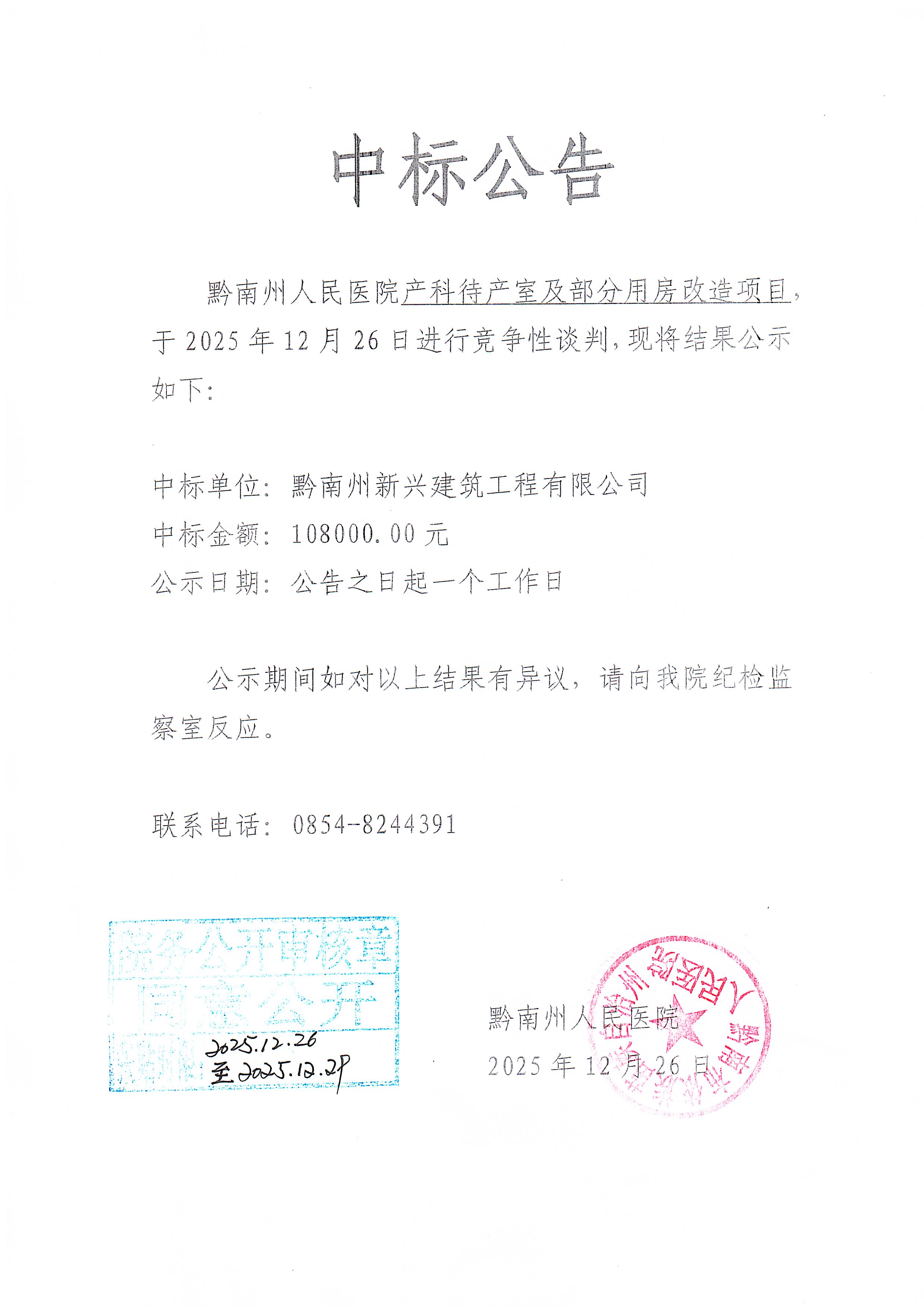 关于黔南州人民医院产科待产室及部分用房改造项目的中标公告