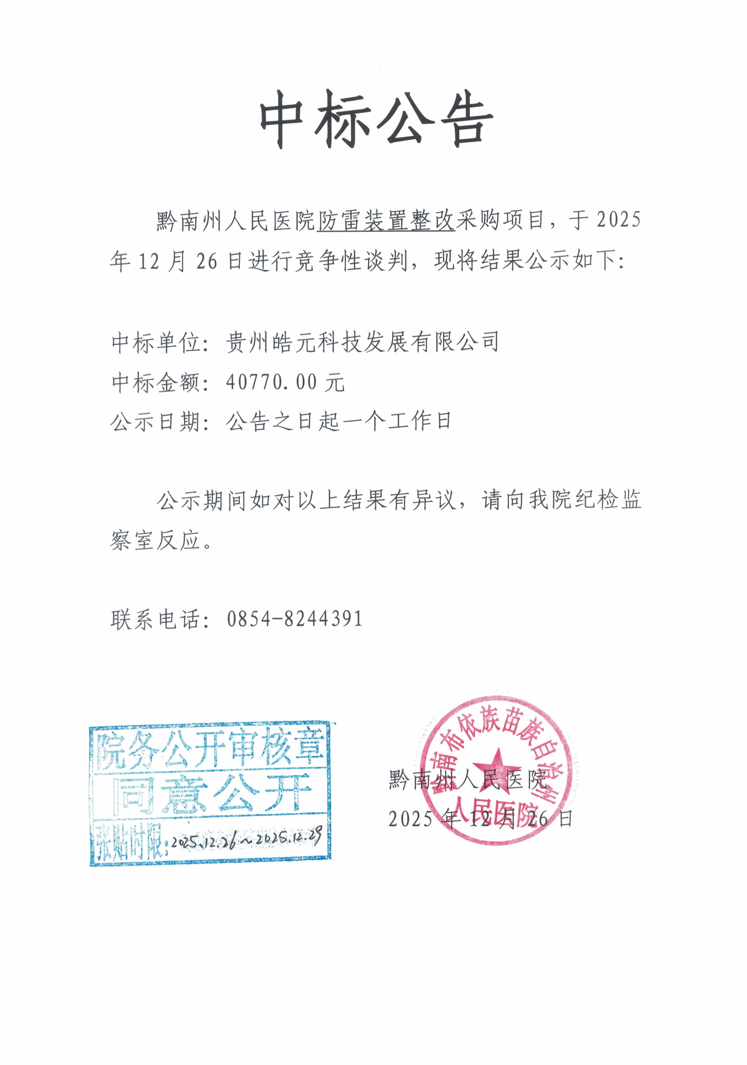 关于黔南州人民医院防雷装置整改项目的中标公告