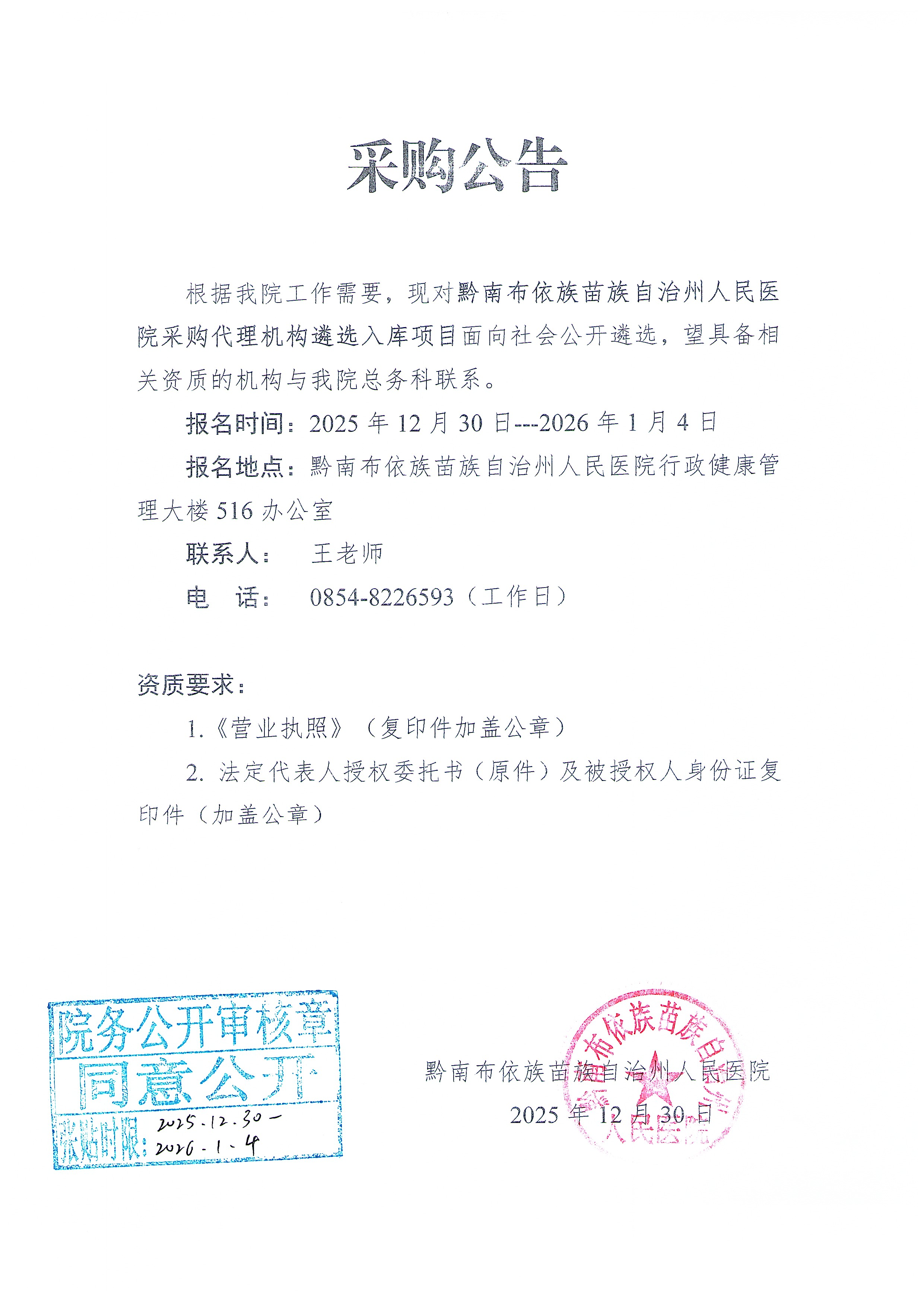 关于黔南布依族苗族自治州人民医院采购代理机构遴选入库项目面向社会公开遴选