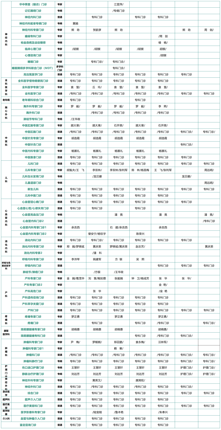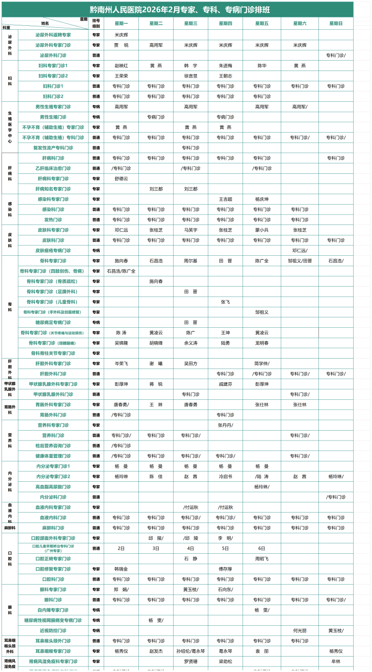 2026年2月专家、专科、专病门诊排班表