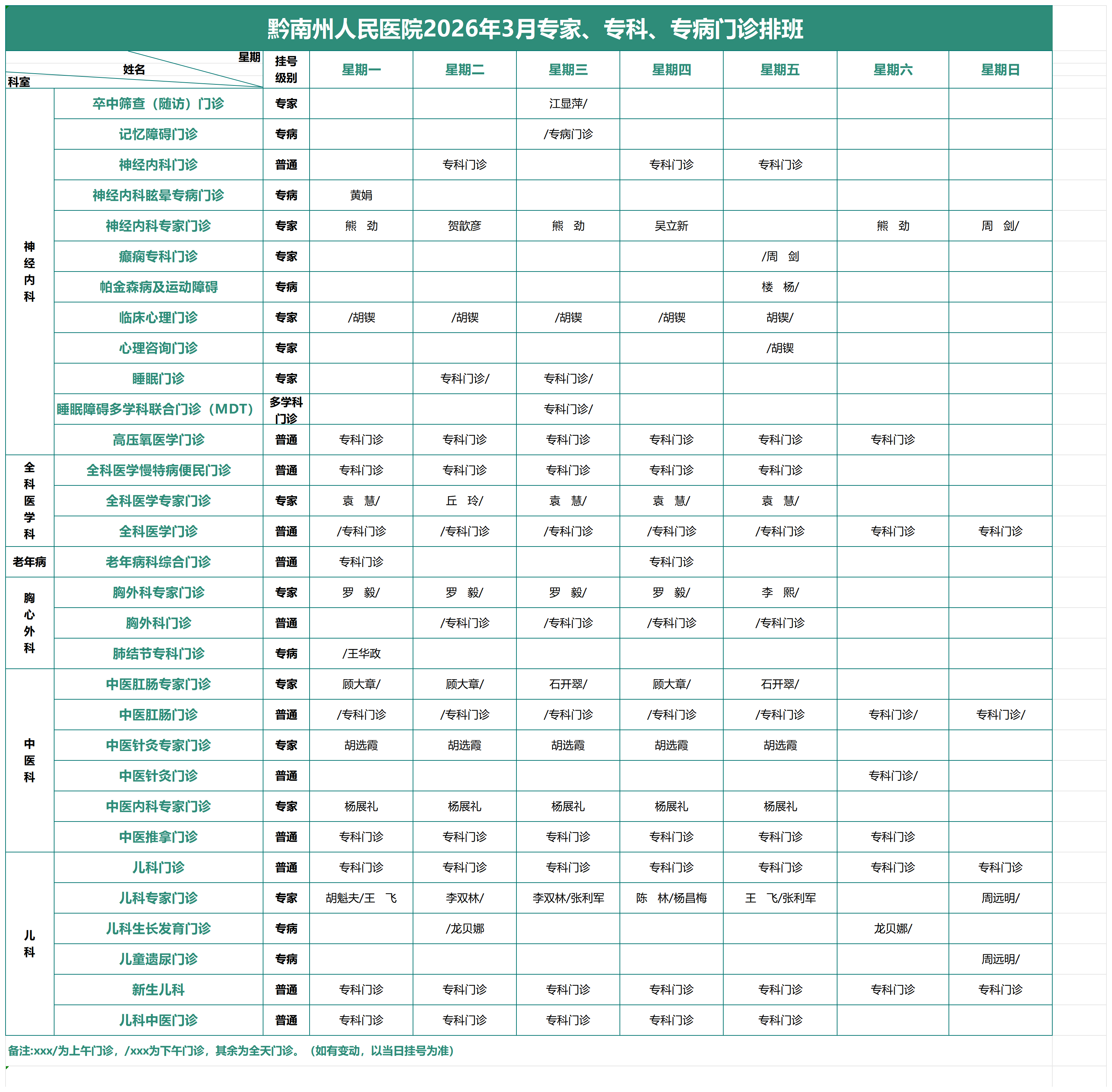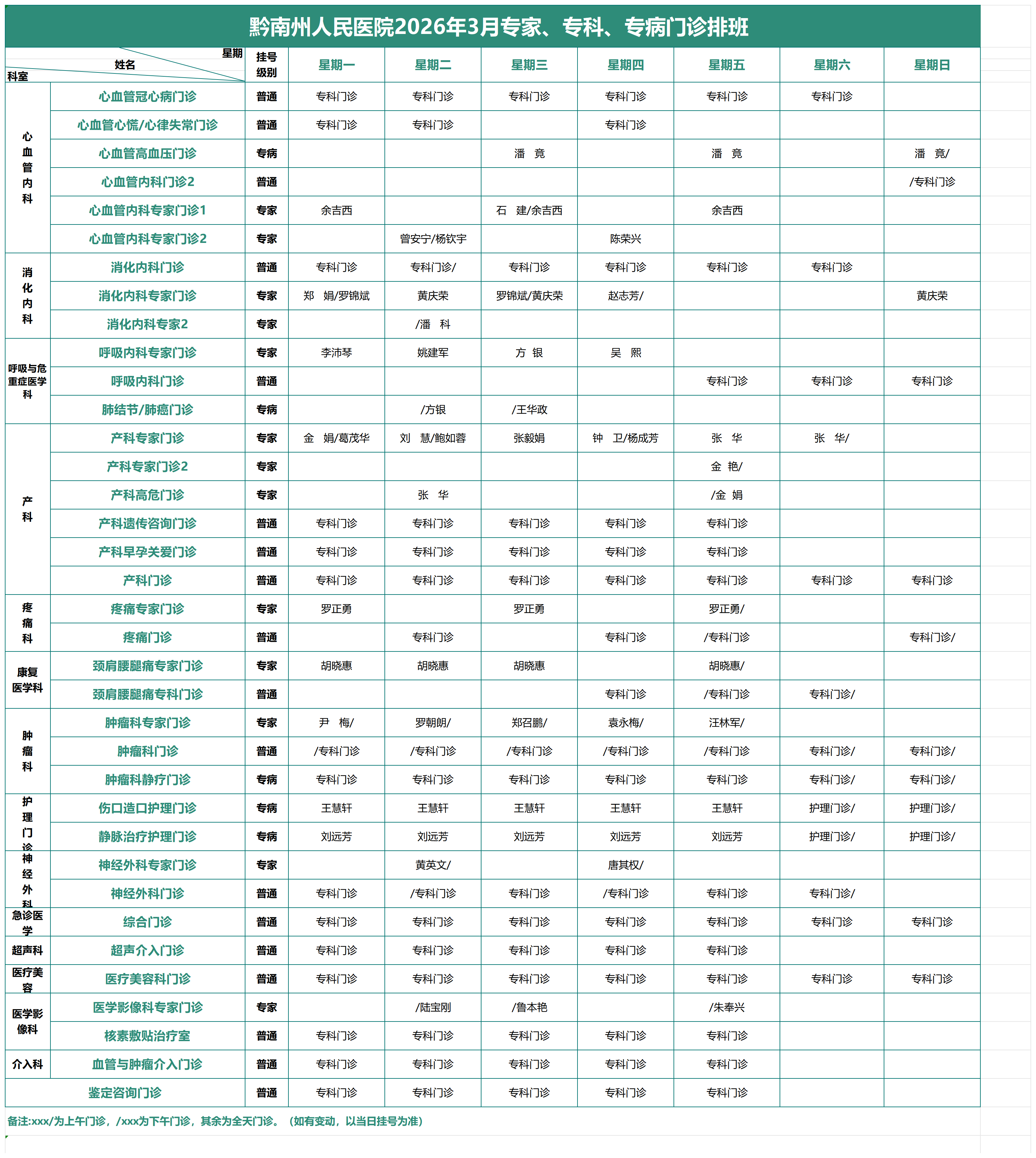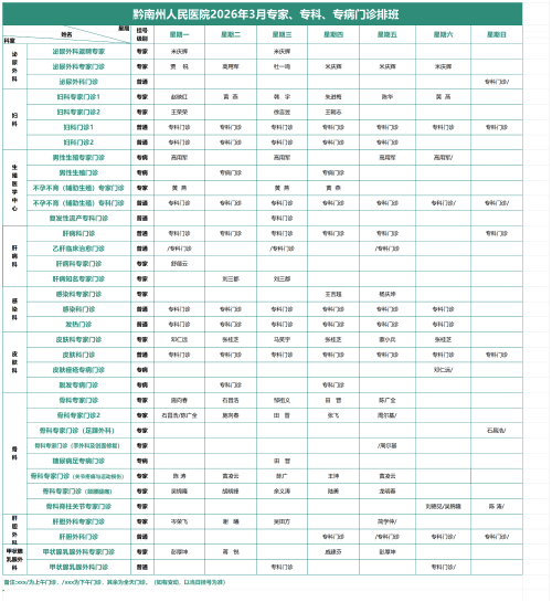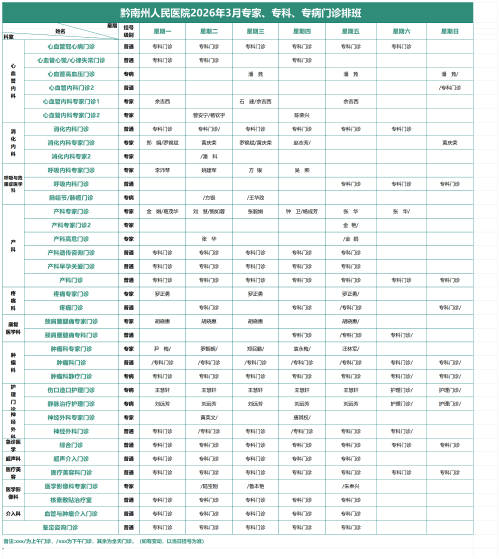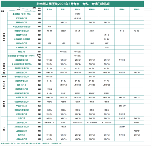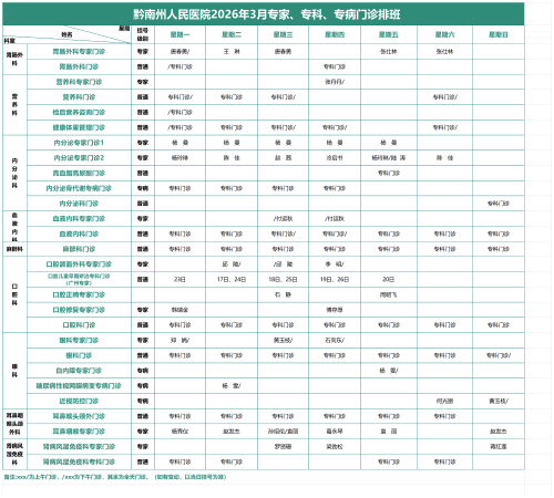 2026年3月专家、专科、专病门诊排班表