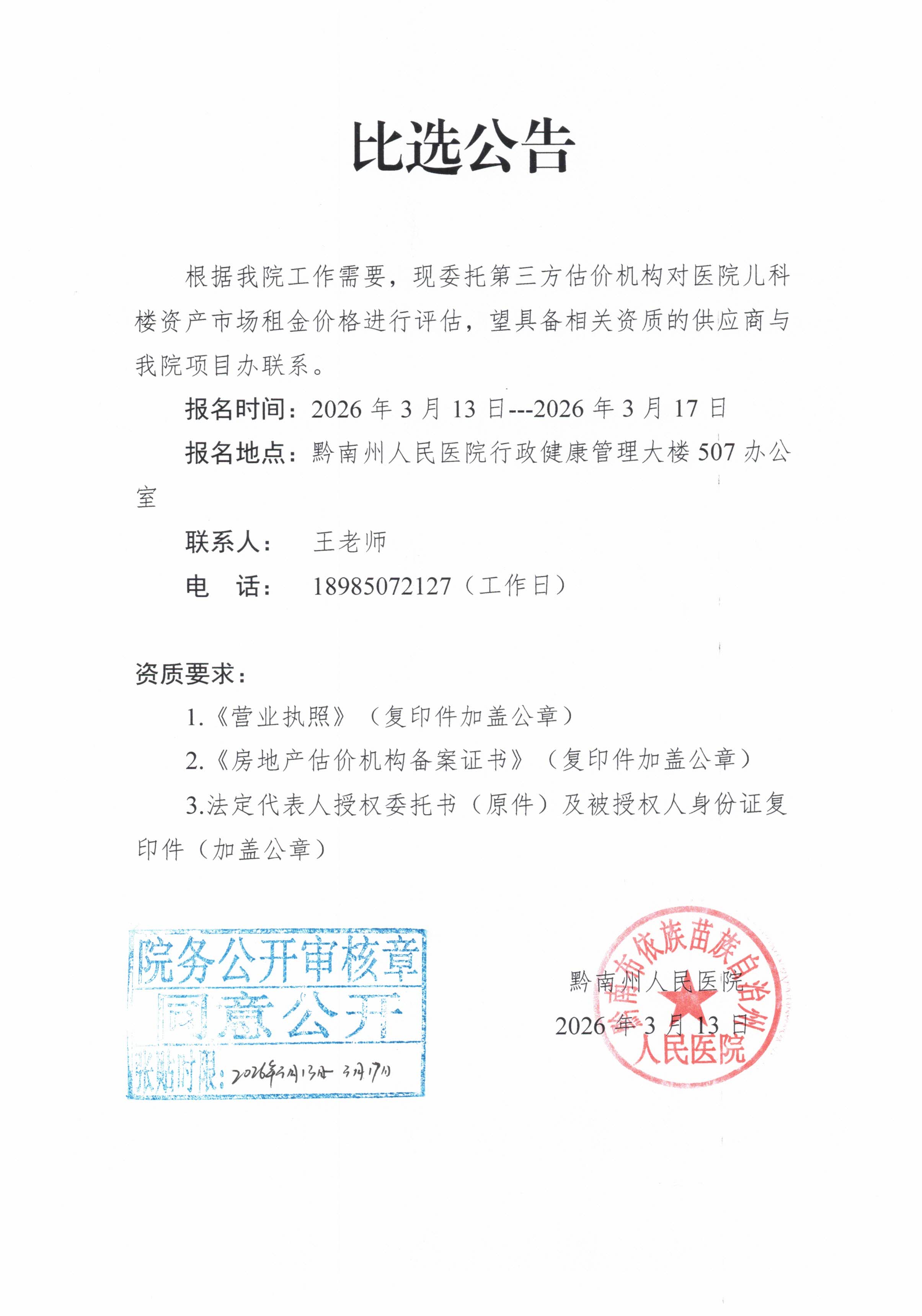 黔南州人民医院关于委托第三方估价机构对医院儿科楼资产市场租金价格评估的比选公告