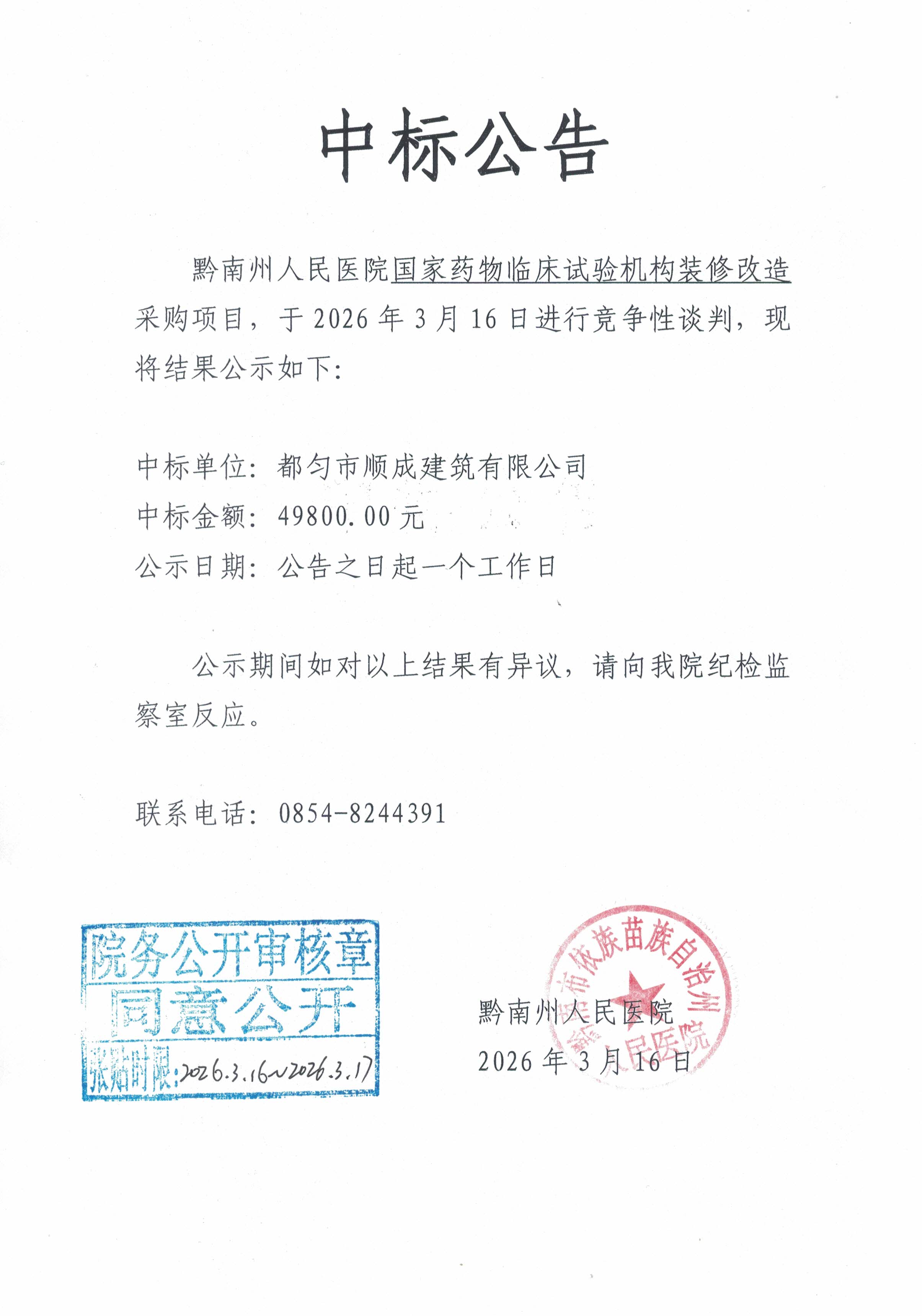 关于黔南州人民医院国家药物临床试验机构装修改造项目的中标公告