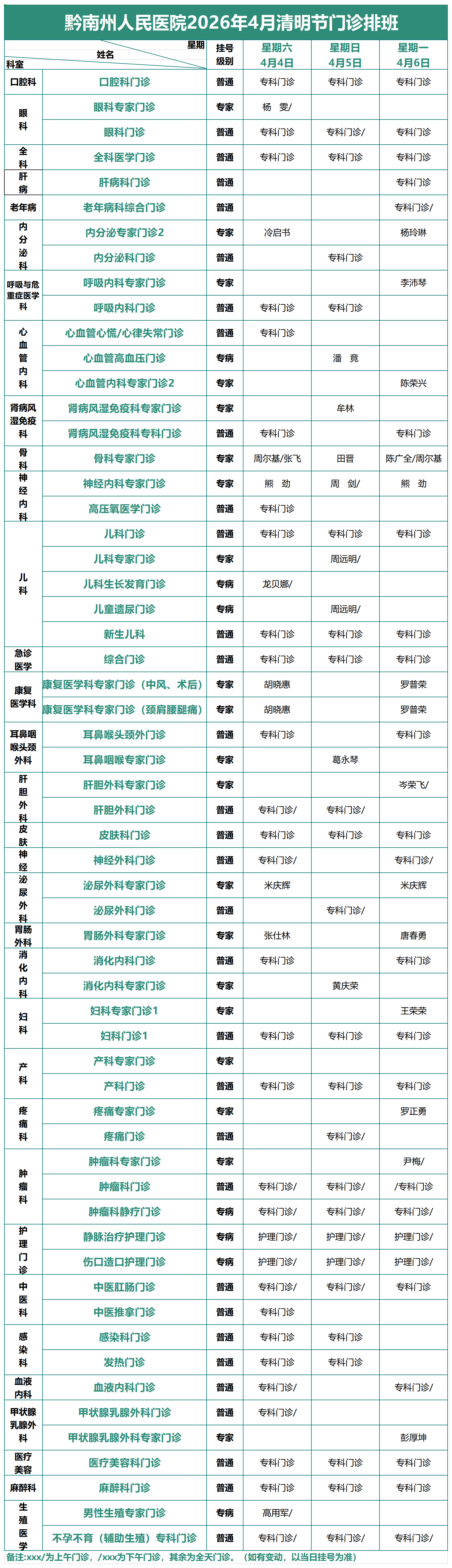 黔南州人民医院2026年4月清明节门诊排班