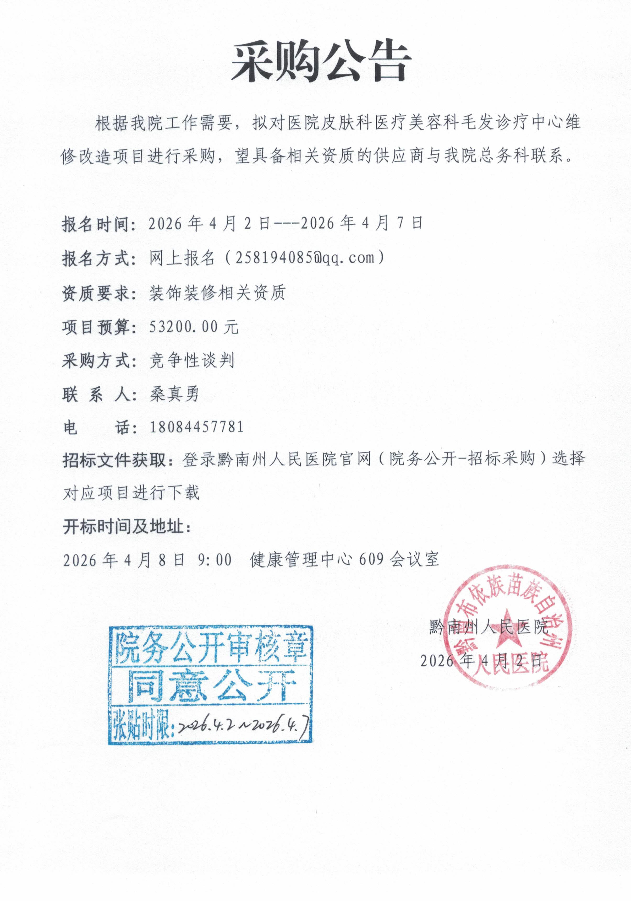 关于黔南州人民医院皮肤科医疗美容科毛发诊疗中心维修改造项目的采购公告