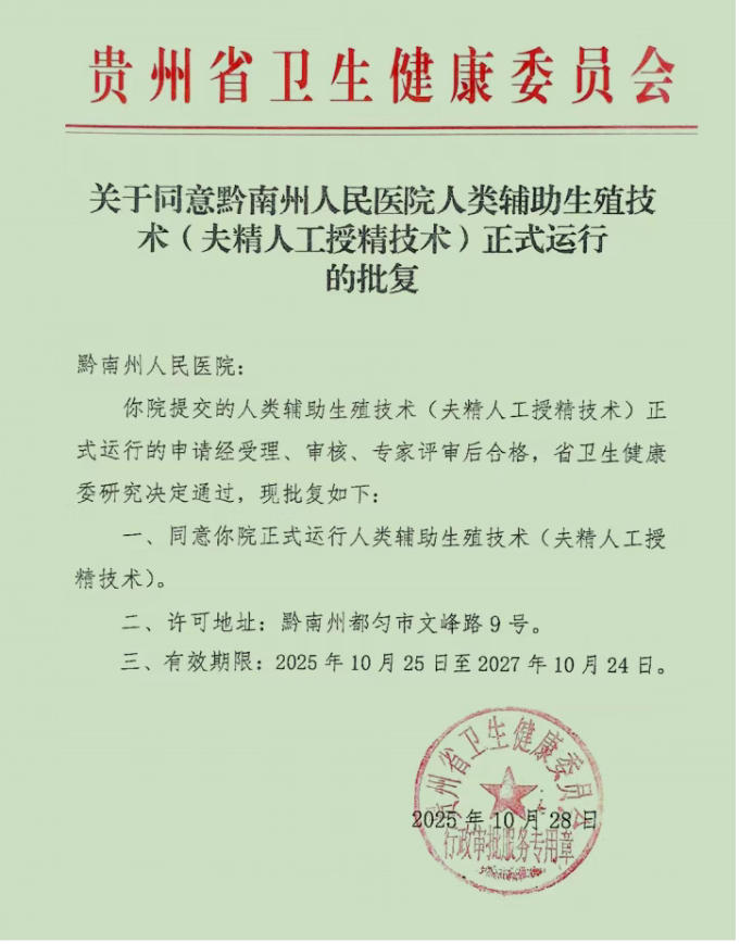 经综合评议,专家组一致认为,黔南州人民医院在场地设施、设备配置、人员资质及技术能力等方面均符合国家相关标准,具备正式运行人类辅助生殖技术(夫精人工授精技术)的条件。