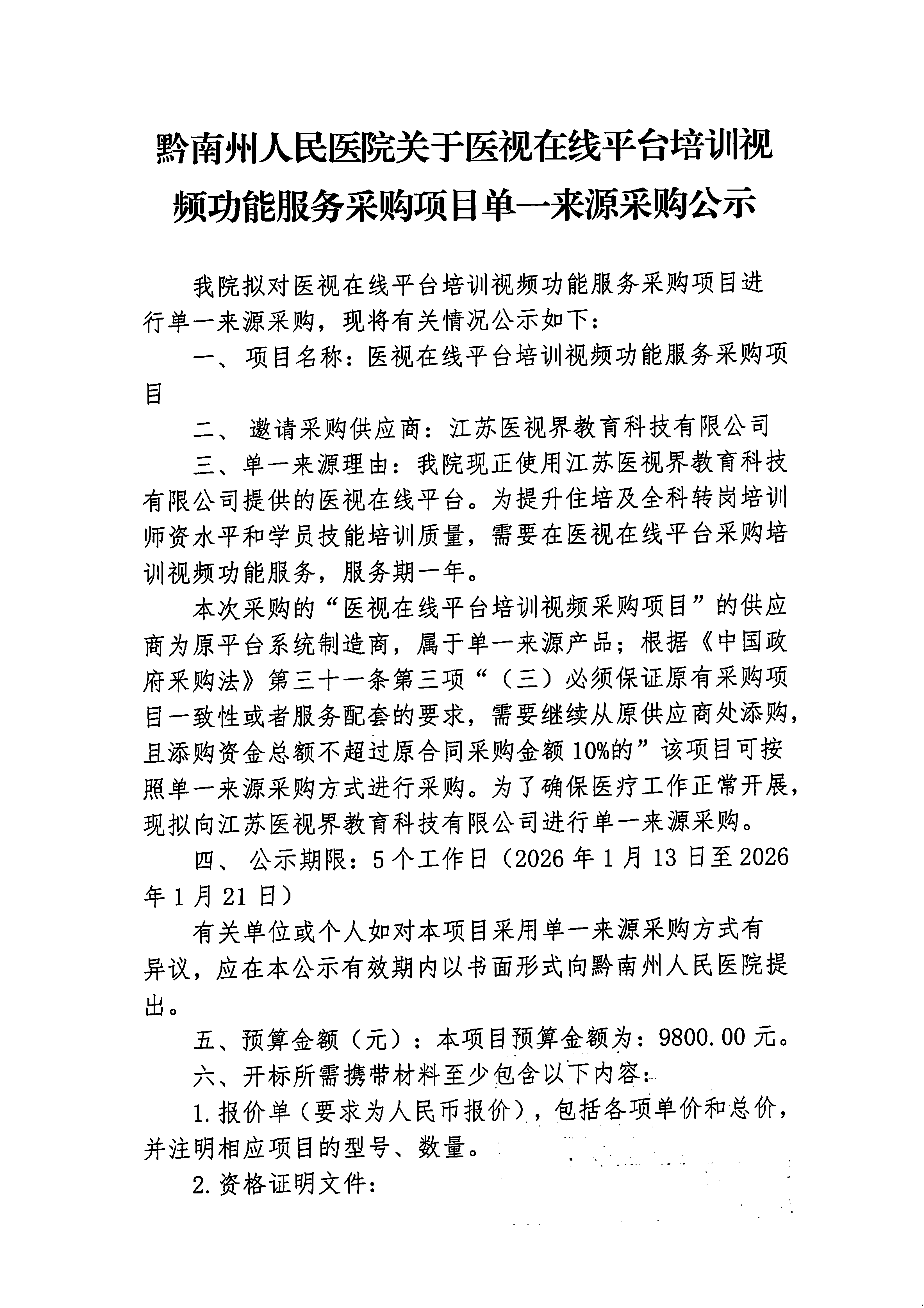 关于医视在线平台培训视频采购项目单一来源采购公示