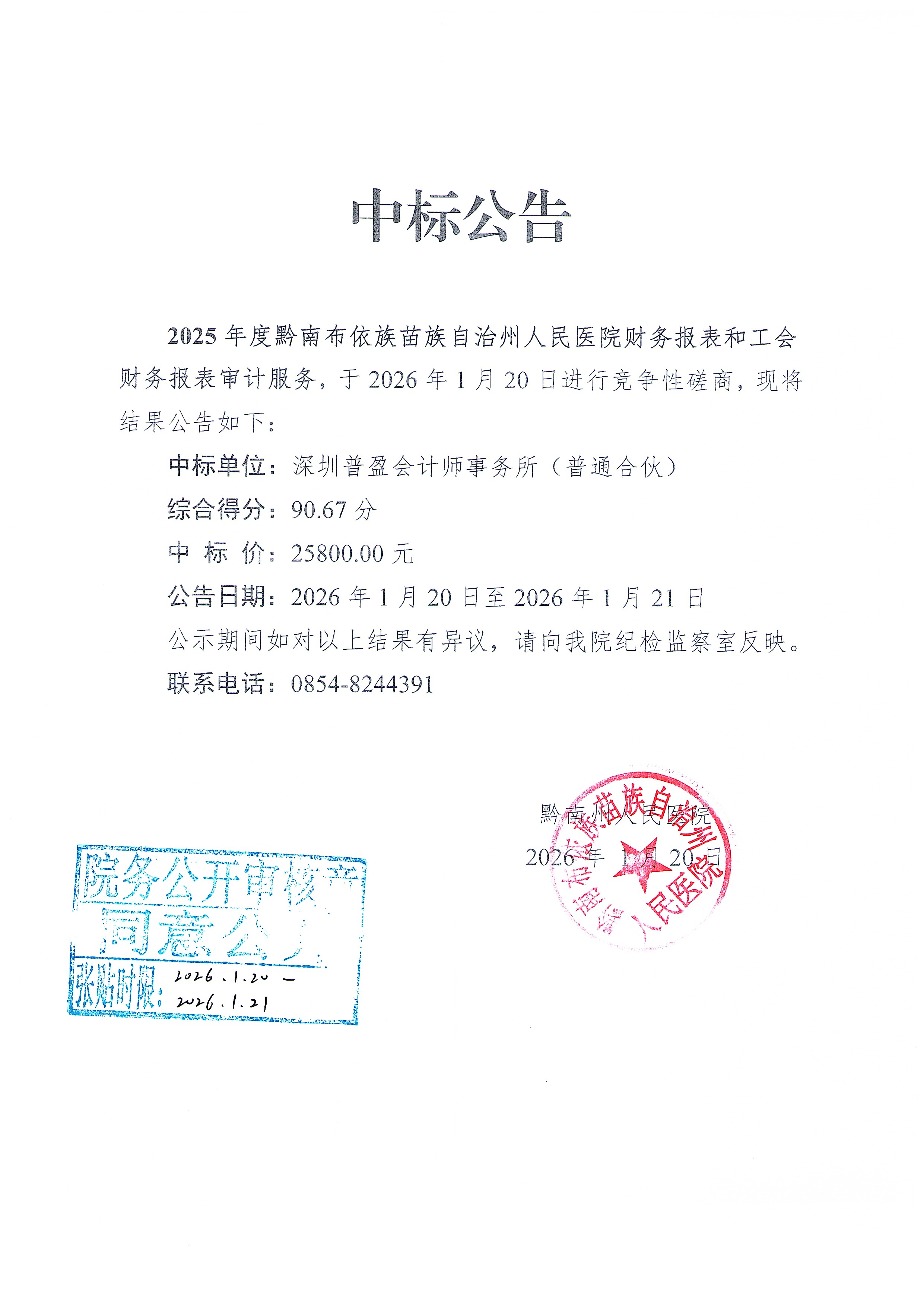 关于2025年度黔南布依族苗族自治州人民医院财务报表和工会财务报表审计服务竞争性磋商的中标公告