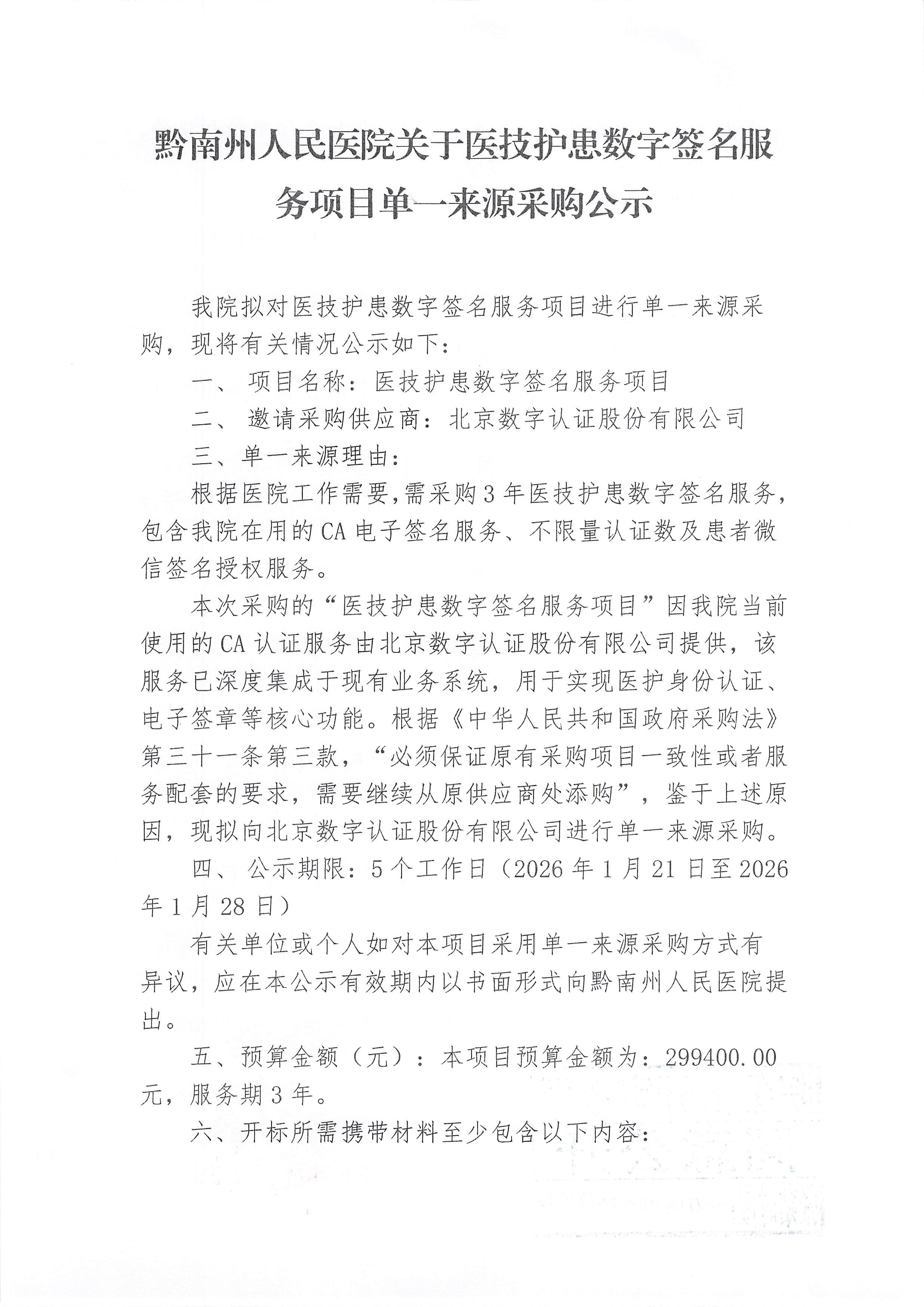 黔南州人民医院关于医技护患数字签名服务项目单一来源采购公示